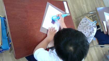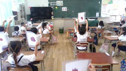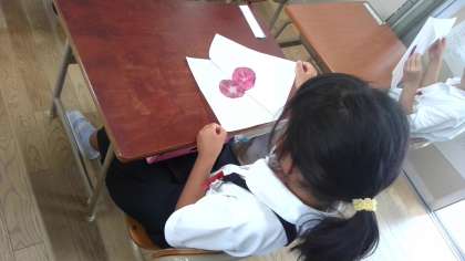 きれいに咲いたあさがおの花で、こすり染めをしました。