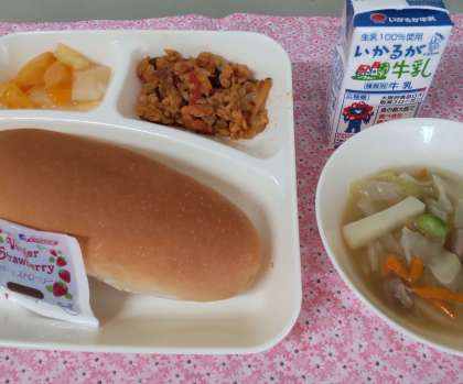 今日の給食では、「押し麦のチキンパエリア」に入っています。
