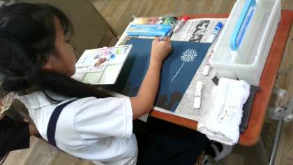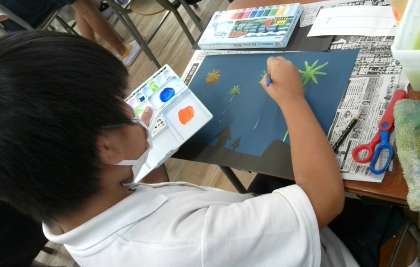 夜の風景を色画用紙を切ってつくり、花火を絵の具でかきました。