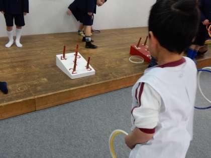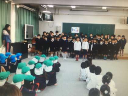 2月22日(月)六反保育園、六反幼稚園、六反南保育園の年長組の園児たちが1年生と交流をしに来ました。はじめに、1年生が「1年生になったら」を歌いました。次に、けん玉やこまなどのゲームコーナーで遊んだり、一緒にじゃんけん列車をしたりしました。最後には、校長先生の歌のおけいこがありました。