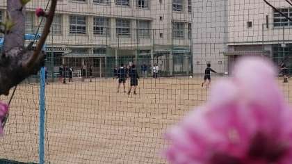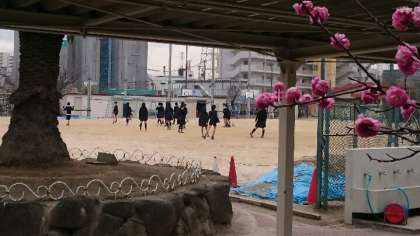 運動場の周りに咲いている桃の花から6年生の姿が見えます。
