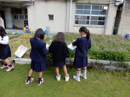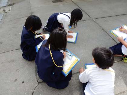 今日は3年の理科の授業で、植物や生き物の観察をしました。絵や特徴をカードに書いたり、葉っぱを触ったりするのを通して、子供たちも普段経験しないことを授業を通して経験出来たので、とても楽しんで活動していました。