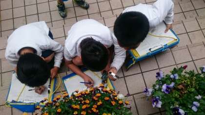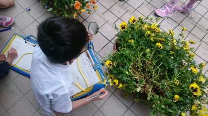 虫眼鏡を使って、玄関のパンジーを観察しました。そこにはいろいろな虫たちもやってきていました。目で見る世界と、虫眼鏡で見る世界との違いを実感することができました。