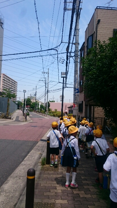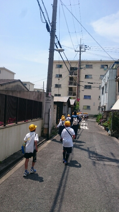 2年生では、校区を回りました。長吉六反小学校と長吉東小学校との統合もあり、長吉東小学校の校区は広くなりました。晴天で、気温が大きく上昇した中、元気よく、校区を歩きました。途中何か所かの公園で休憩をしました。