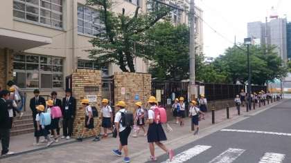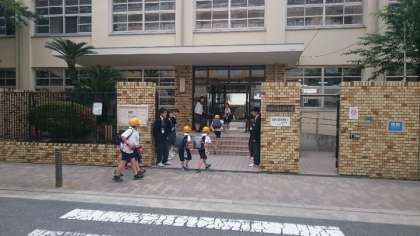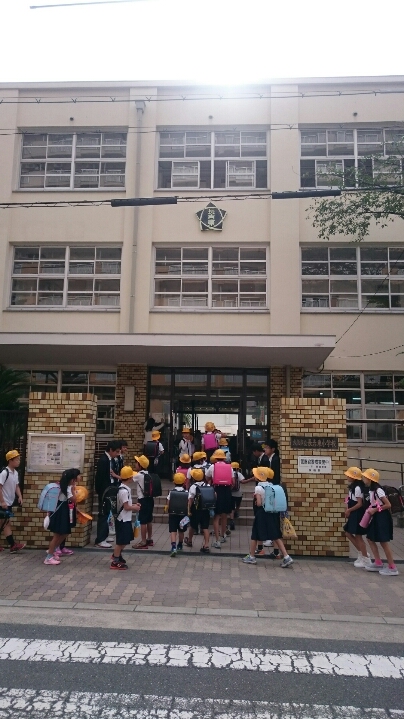 朝は、長吉東小学校の玄関に立って、元気のいい、