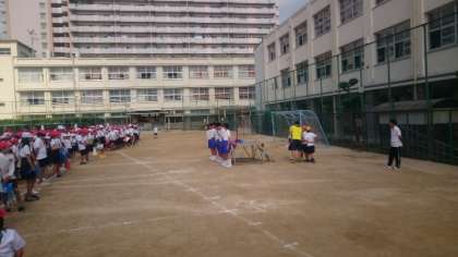 児童集会時に、長吉六反中学校から来た7人の中学生の紹介がありました。