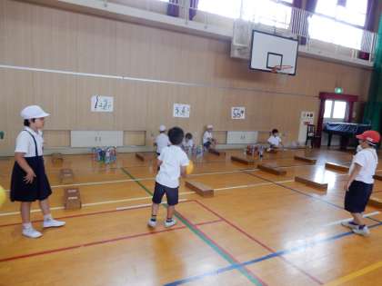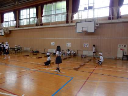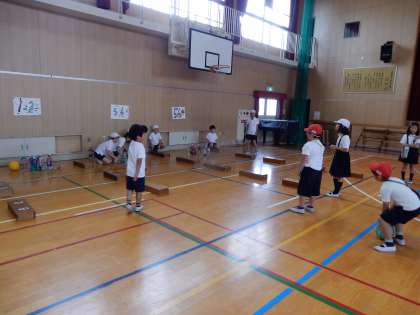 4年2組はペットボトルボウリングです。体育館でみんなが楽しんでいる声がすごく聞こえていました。