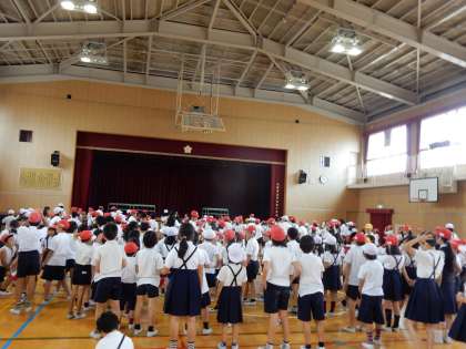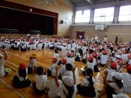 今日の児童朝会は「船長さんが言いました。」というゲームをしました。児童みんなが船長の言うことを聞いてポーズをとっていて、楽しそうでした。