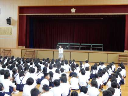 今日の朝、児童朝会を行いました。今週のめあては「上ぐつのルールを守ろう」です。また廊下、階段を走っている児童が目立ちます。家庭でのご指導をお願いします。