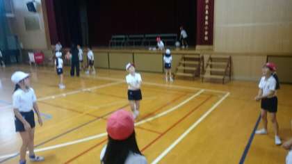 雨はやみましたが、運動場の状態が悪いので、体育館で体育をしています。