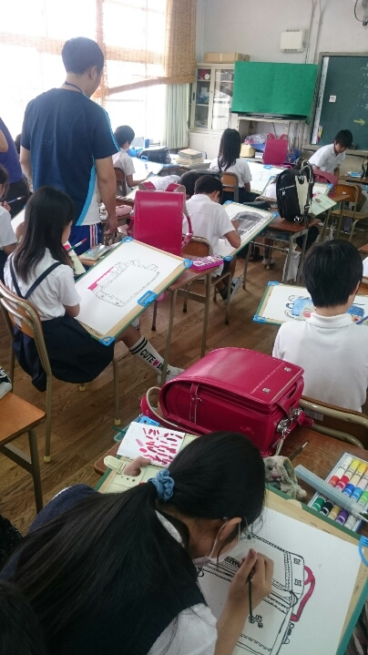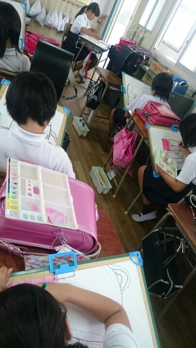 自分の使っているランドセルの線描と着色をしました。