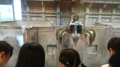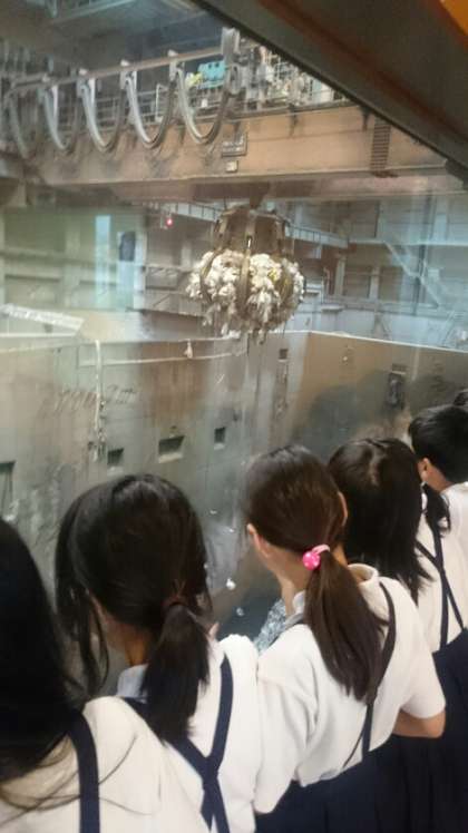 普段は、自動運転だそうですが、本日は、長吉東小学校の4年生が見学に来ているということで、工場の方のご厚意で、手動運転に切り替えて、実際の様子を観察することができました。大きなクレーンに驚きました。