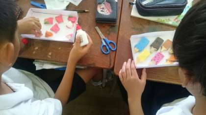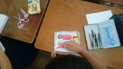 紙粘土を使って、細かいところまで丁寧に形を作り上げ、着色しました。