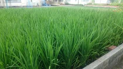 長吉東小学校の水田のイネは強い日差しを浴びてすくすく育っています。