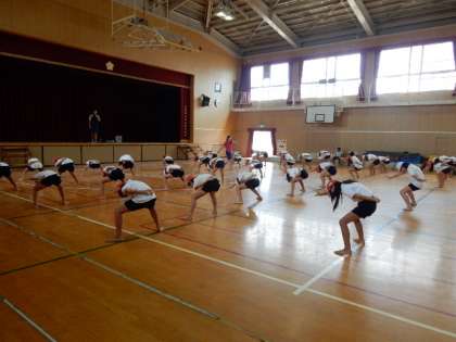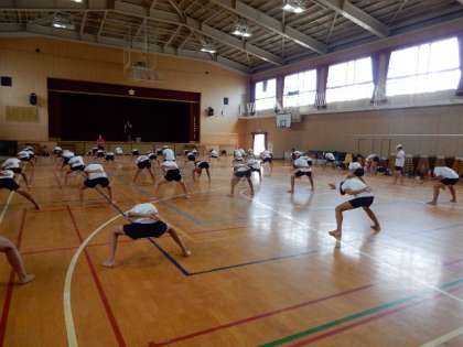 今日の5時間目に6年生は体育館で踊りの練習を行いました。大きい声で「やー!!」と声を出して踊っていました。