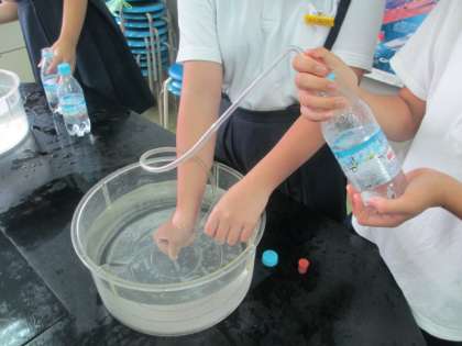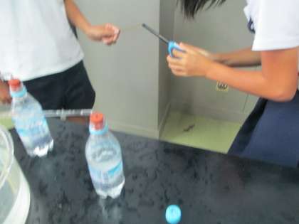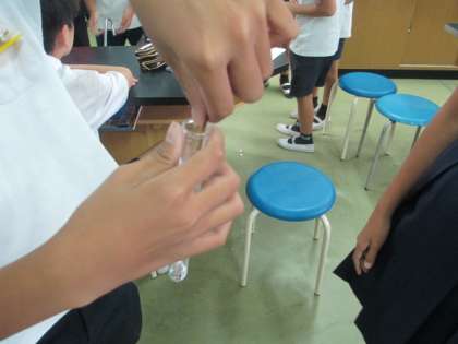 日頃飲み慣れている人も多い、炭酸飲料ですが、その炭酸水の中には、いったい何が溶けているのでしょう。炭酸水の入ったボトルを振って、その中に溶けている気体を試験管に集め、実験をします。