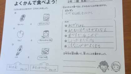 「よくかんでたべよう」というめあてで栄養教育指導が行われました。噛むことでどんなよいことがあるのかを考えながら、噛むことの大切さを学ぶことができました。学級全体で今日からよく噛むことを約束しました。