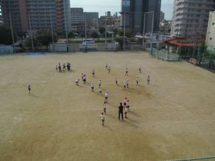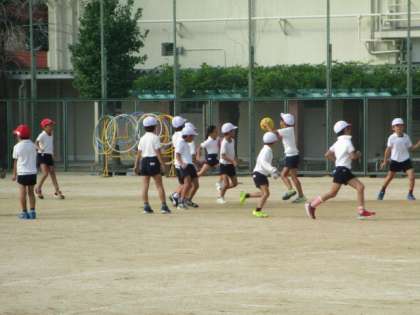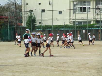 秋のさわやかな日差しの中運動場で体育をしました。