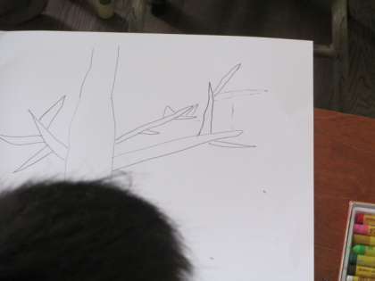 画用紙に地面と大きな木を描きます。