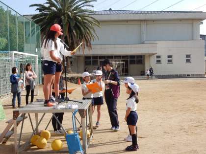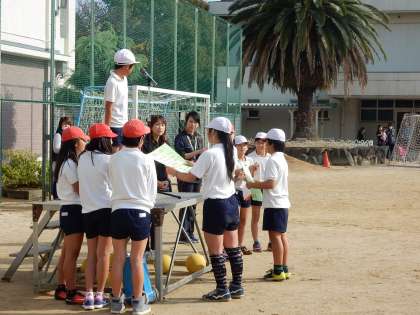 表彰式の様子です。各チームの代表の児童が賞状を受け取っています。