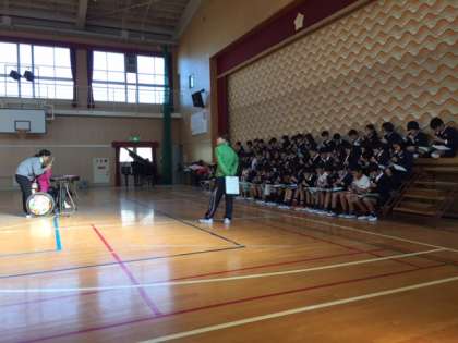 本日2時間目に、平野支援学校から1名の友だちが遊びに来てくれ、交流会を行いました。今年度、新しくできた校歌を聞いてもらい、リコーダーで「カノン」の曲をプレゼントしました。木琴で、演奏にも参加してくれていました。