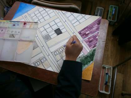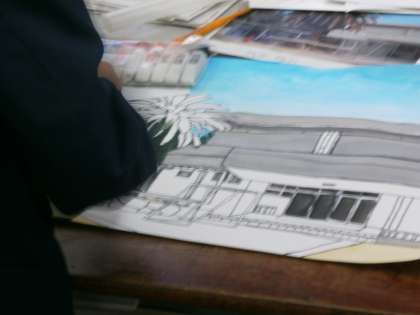 学校の写生も着色に入り、完成に近づいています。