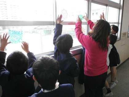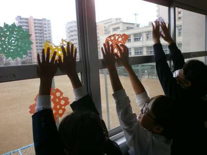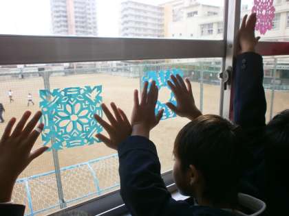 色紙を折って、折れ目を切っていき、広げると素敵な模様になります。