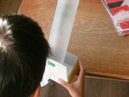 ストローから息をふくと、箱の中に入っている小さなビニル袋が飛び出します。