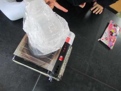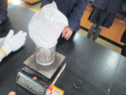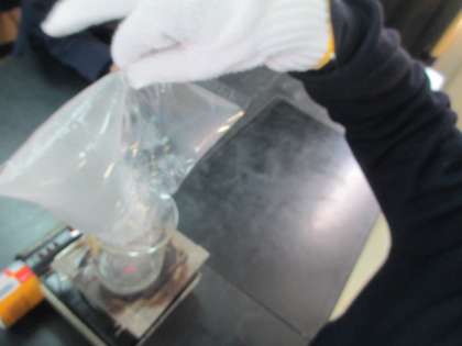 ビーカーにろうとを入れ、ビニル袋のふくらみを観察します。