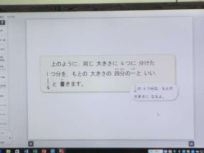 4分の1について、図形を使って視覚的にとらえています。