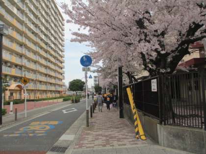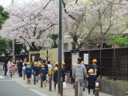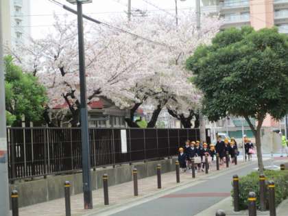雨の心配もありましたが、傘をさす必要もなく、集団登校の元気な長吉東の子どもたちが登校しました。玄関前の桜が満開。