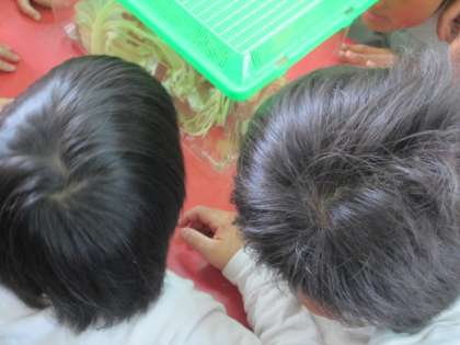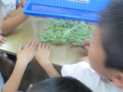学習園のキャベツについていた卵や幼虫を教室で観察しています。