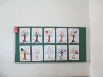 先日図工の学習で制作した作品が完成し、「色の木」の作品を掲示しました。