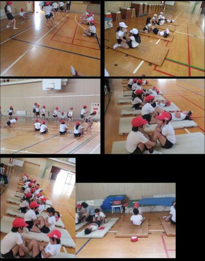 体育館で、上体起こしと反復横跳びをしている様子です。