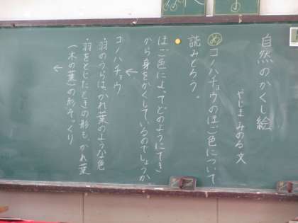 の学習を進めています。保護色の意味をしっかりと学習した後、いろいろな動物が自然の中で、天敵に見つからないようにする方法を読み取っていきます。