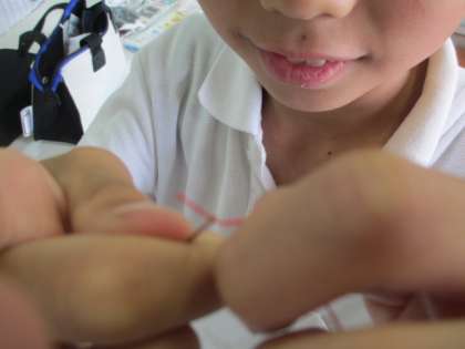 ボビンに色を入れて、上糸のかけ方、下糸の出し方。