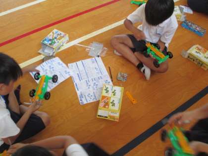 ゴムをどのようにすれば、遠くまで走るかを実験しました。