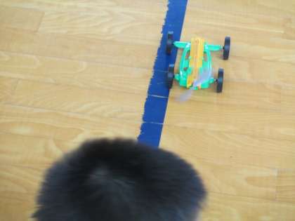 ゴムの力を使って車を走らせました。