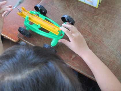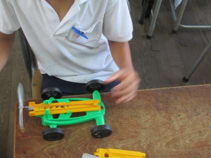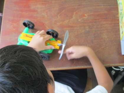 机の上の端から端まで、プロペラを何回転させればちょうど動くのかを試してみました。