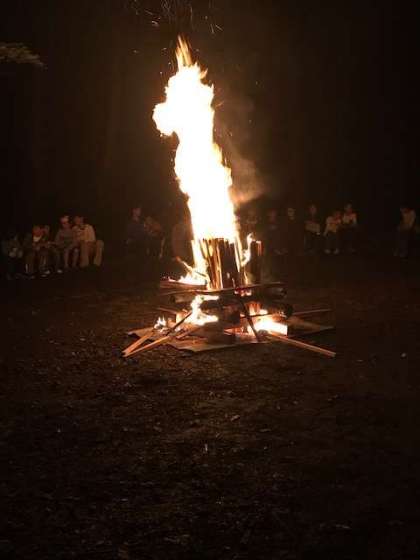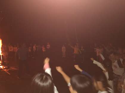 キャンプファイヤーが始まりました。燃えろよ燃えろーよ。みんなでもりあがっています。