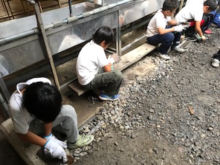 焼き板づくりが始まりました。真っ黒になりながら、焼き板を必死でみがいています。