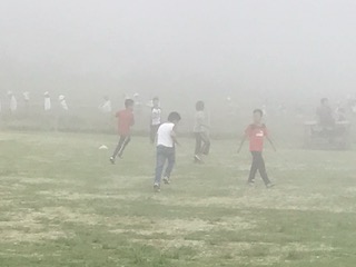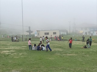 子供たちがホテル前の芝生で思い思いに遊んでいます。