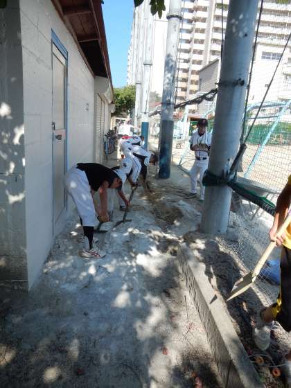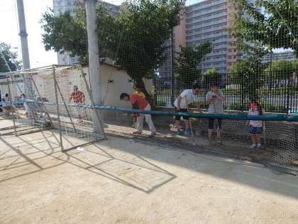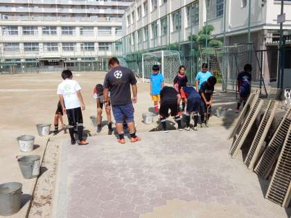 8月6日(日)に体育施設開放で運動場を使用している団体(長吉東SC(サッカー)、出戸ワイルドメッツ(野球)、シックスフィールド(ソフトボール))の皆さんが、運動場の側溝の清掃をしました。大変暑い中、大人も子どもも汗をかきながら、溝にたまっていた砂を掘り出し運んでいました。何年もの間に砂が少しずつたまり、水はけが悪くなっていた側溝がとてもきれいになりました。本当にありがとうございました。