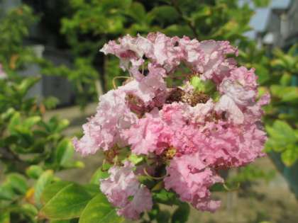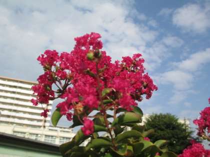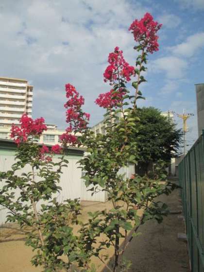 講堂北側の樹木の中にあるサルスベリの花が咲いています。