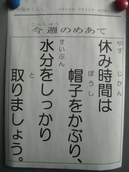 「休み時間は帽子をかぶり、水分をしっかり取りましょう」