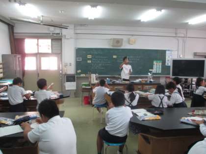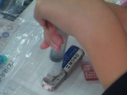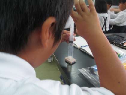 注射器に決められた量の空気を入れて、力を加えていきます。