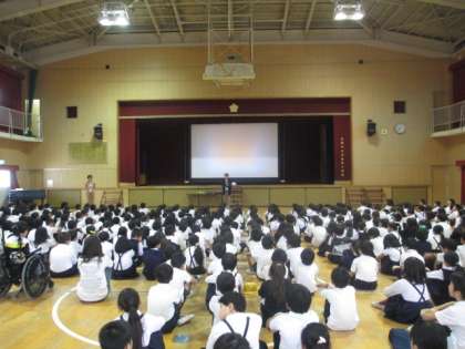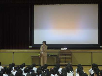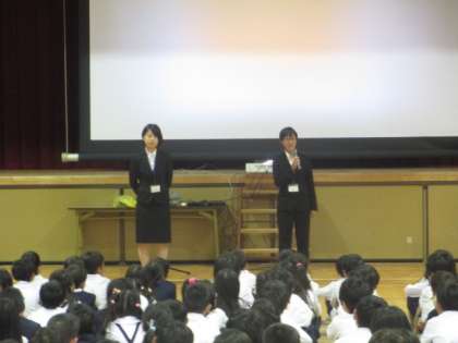 校長先生のお話のあと、10月3日から着任された先生の紹介と、一か月間頑張っていた実習生のお別れの挨拶がありました。実習生は、今日で最後ということではありませんが、もう、実習期間も残すところが少なくなりました。全校の皆さんの前に出るのは今日で最後になります。
