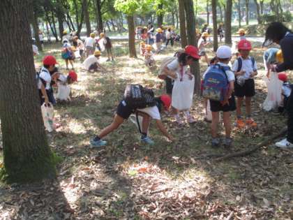 昼食後、1年生は、林の中に行き、どんぐりを拾いました。