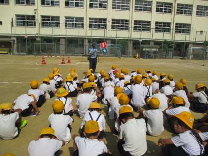 平野警察よりおまわりさんを派遣していただき、交通安全教室を行いました。3年生は、歩行についてです。正しく道を横断したり、歩行したりするやり方を教えていただきました。