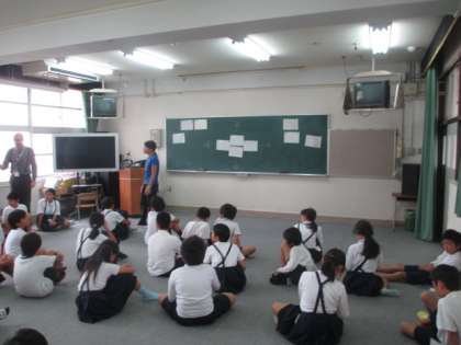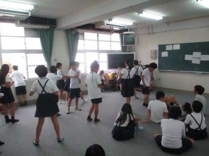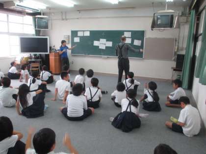 先生のジェスチャーで色を英語で言います。